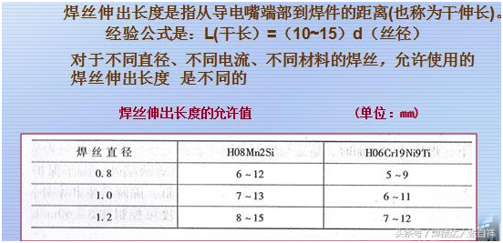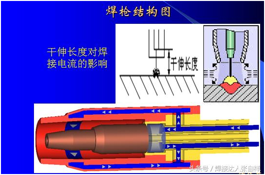 氣保焊的構造如上圖所示,在焊接過(guò)程中干伸長(cháng)度的計算是從導電嘴到工件的距離,而不是從噴嘴到工件的距離,根據電流的大小,干伸長(cháng)短也有不同的要求,如超出規范會(huì )影響焊接的穩定性和焊接質(zhì)量。